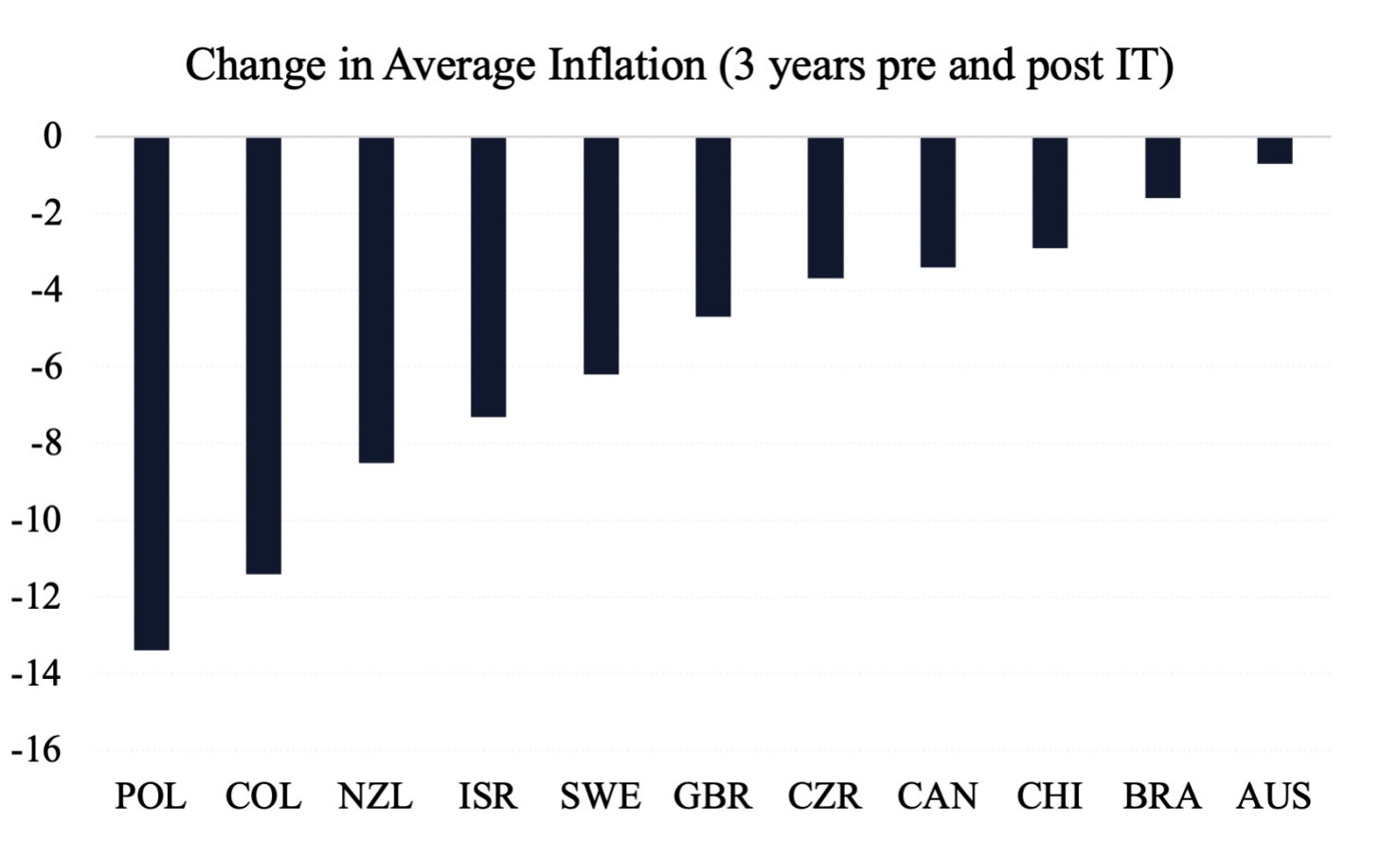 Inflation targeting started out with a bang. All nine of the initial adopters of the regime saw a decline in the three-year average inflation following adoption.