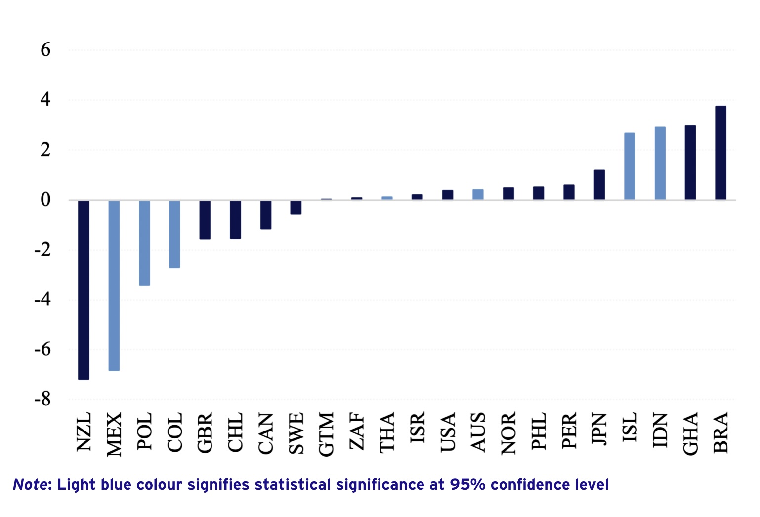We go further in trying to isolate the contribution of inflation targeting to moderating inflation through a country-by-country synthetic control method (SCM) analysis. That is, we compare the inflation performance in an inflation-target-adopting country with that of a synthetic ‘twin’ country that did not adopt an inflation target regime. The synthetic ‘control’ country shares the key characteristics of the ‘treatment’ country (the inflation target adopter), including similar inflation experience prior to the adoption of an inflation target. The results from our synthetic control analysis suggest that inflation targeting significantly lowered inflation (compared to that in the synthetic control) in only six of our 23 cases. This is shown in light blue in Figure 4.