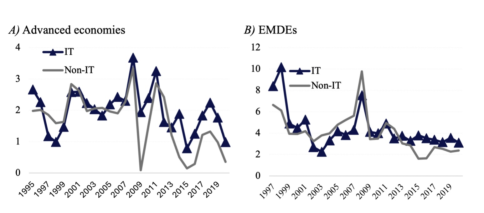We illustrate this by comparing the change in inflation rate after adoption of inflation targeting with the initial inflation rate in Figure 2. Countries that experienced a higher inflation rate (shown on the x-axis) happened to have also been the ones which experienced the largest declines in their inflation (y-axis) after the adoption of inflation targeting. We find that Ball and Sheridan’s conclusion still holds, even with a few additional decades of data; moreover, it holds with as much force for EMDEs as for advanced economies. In short, ‘regression to the mean’ remains a powerful explanation for the supposed better inflation performance of IT adopters.