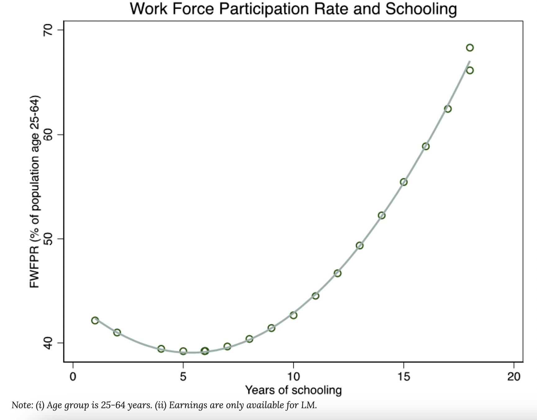 Our analysis reveals that education impacts rewards from work in a ‘non-linear’ manner (that is, initial returns to education are limited at lower years of education and as the years of education increase, so do the marginal returns to education), both in LM and HH. These impacts also differ substantially between LM and HH. This non-linearity and differential impact generate the U-shaped relationship between education and FLFPR (see Figure 1).